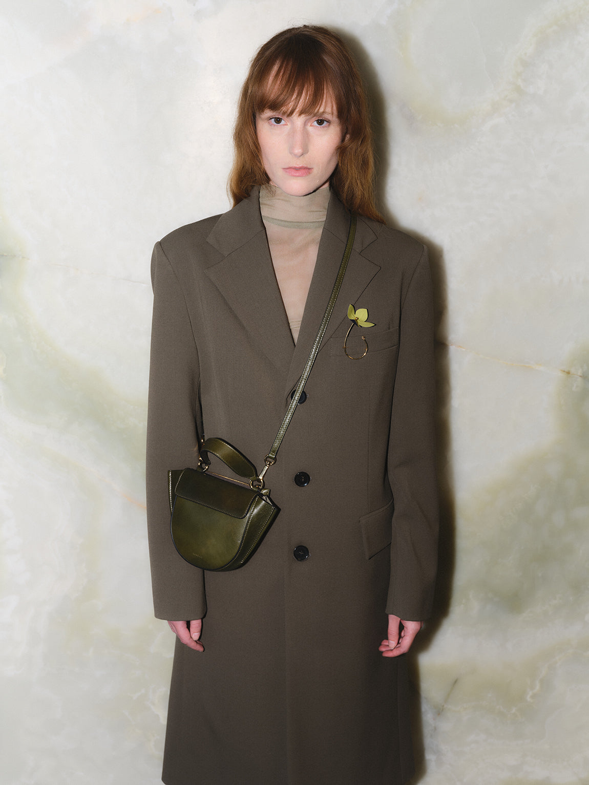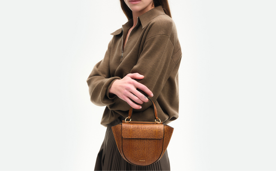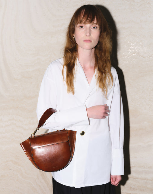 The Hortensia Bag, features a significant round shape with trapeze detail, giving it a soft feminine appearance. Its full silhouette has multiple pockets to keep belongings in place and two top handles – a hand-held and shoulder strap. The Hortensia Bag comes in a medium and mini, and piccola size.