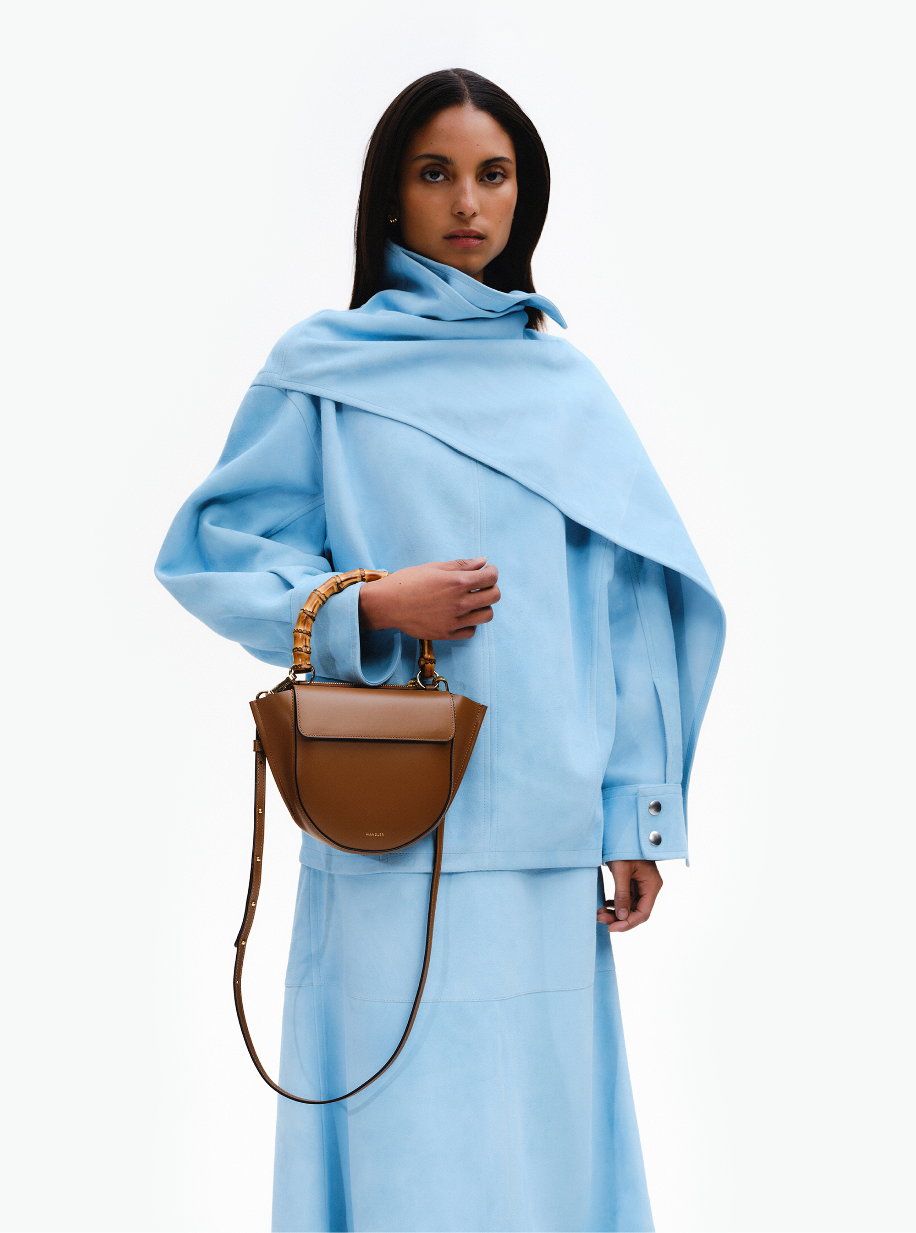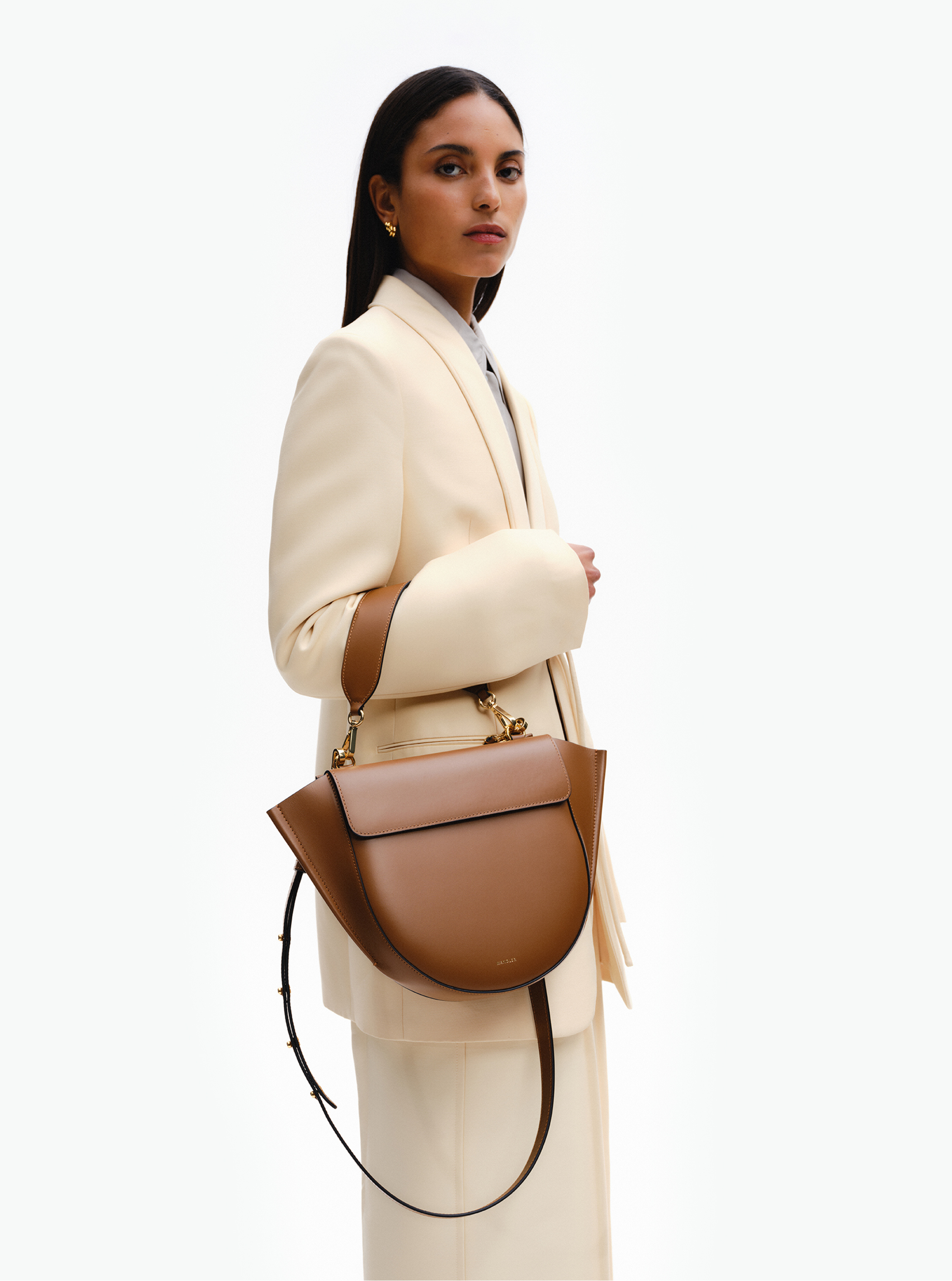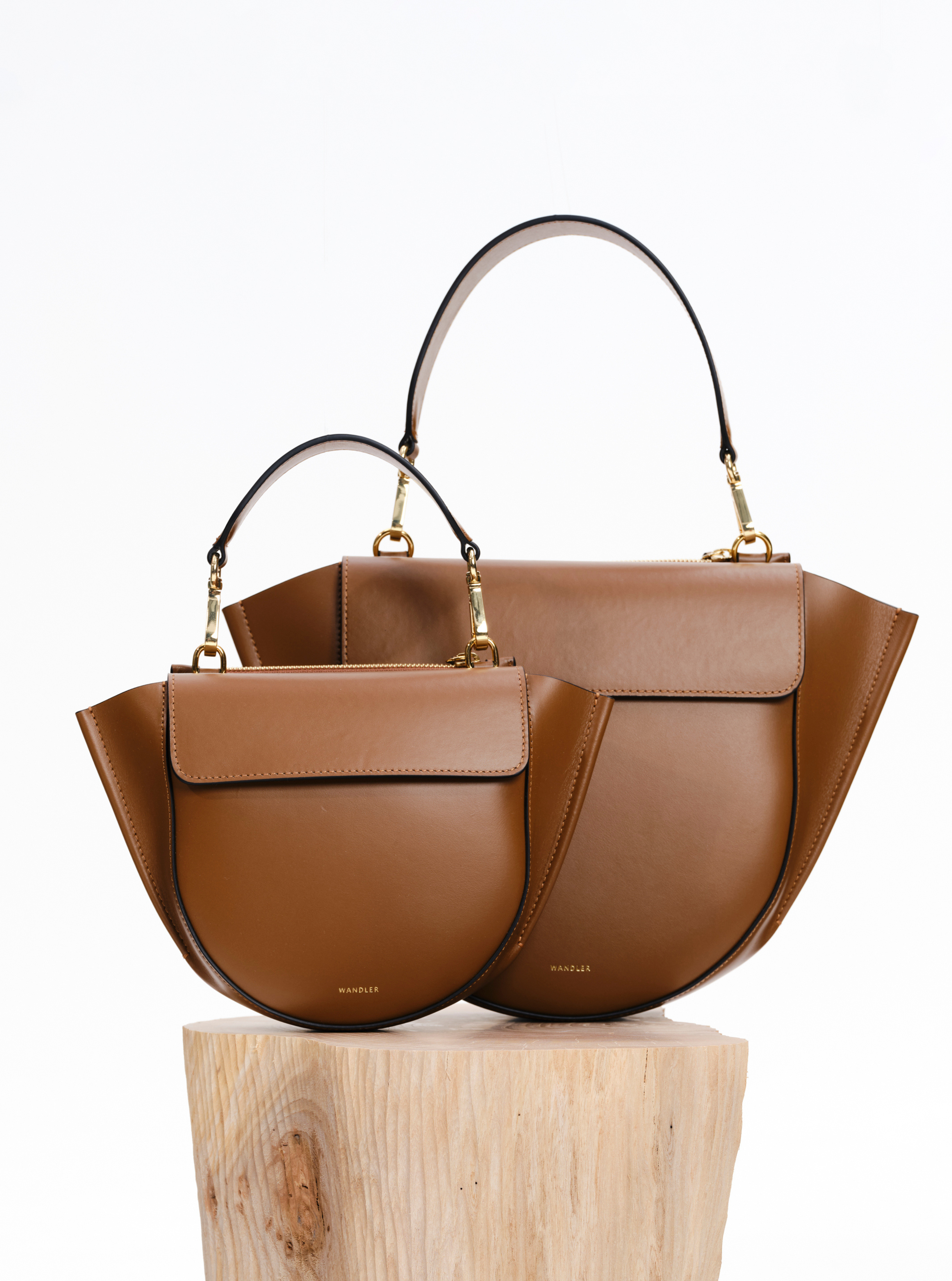 The Hortensia Bag is Wandler’s most recognizable design. Made in Italy from premium calfskin leather, this design features a round shape with trapeze-wing details. Available in Mini and Medium size.