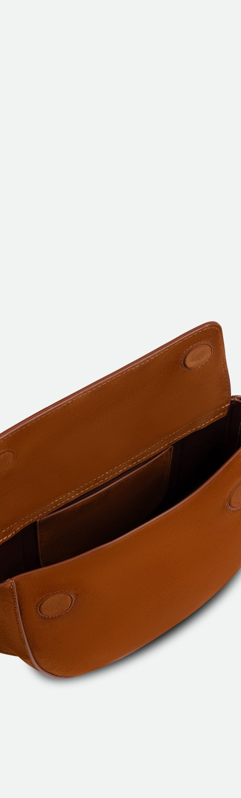 Das glasierte Leder verleiht den Taschen Tiefe und Eleganz; erhältlich in der Farbe Cognac
