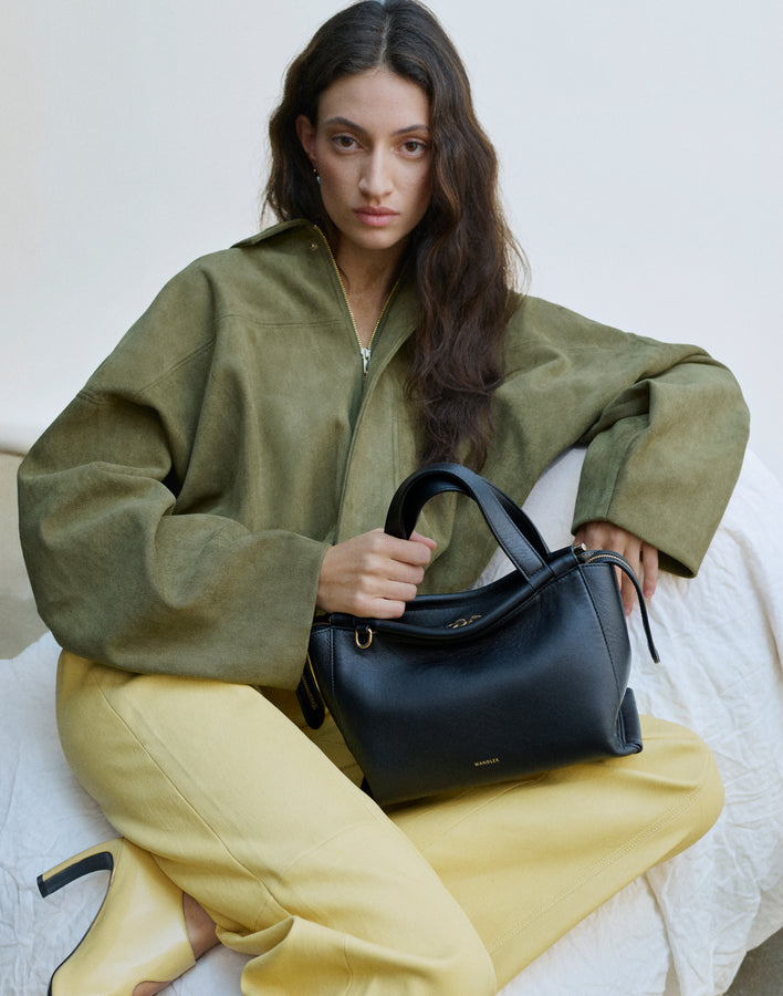 Eine skulpturale Henkeltasche mit sicherem Innenfach und verstellbarem Riemen, die auf verschiedene Arten getragen werden kann.