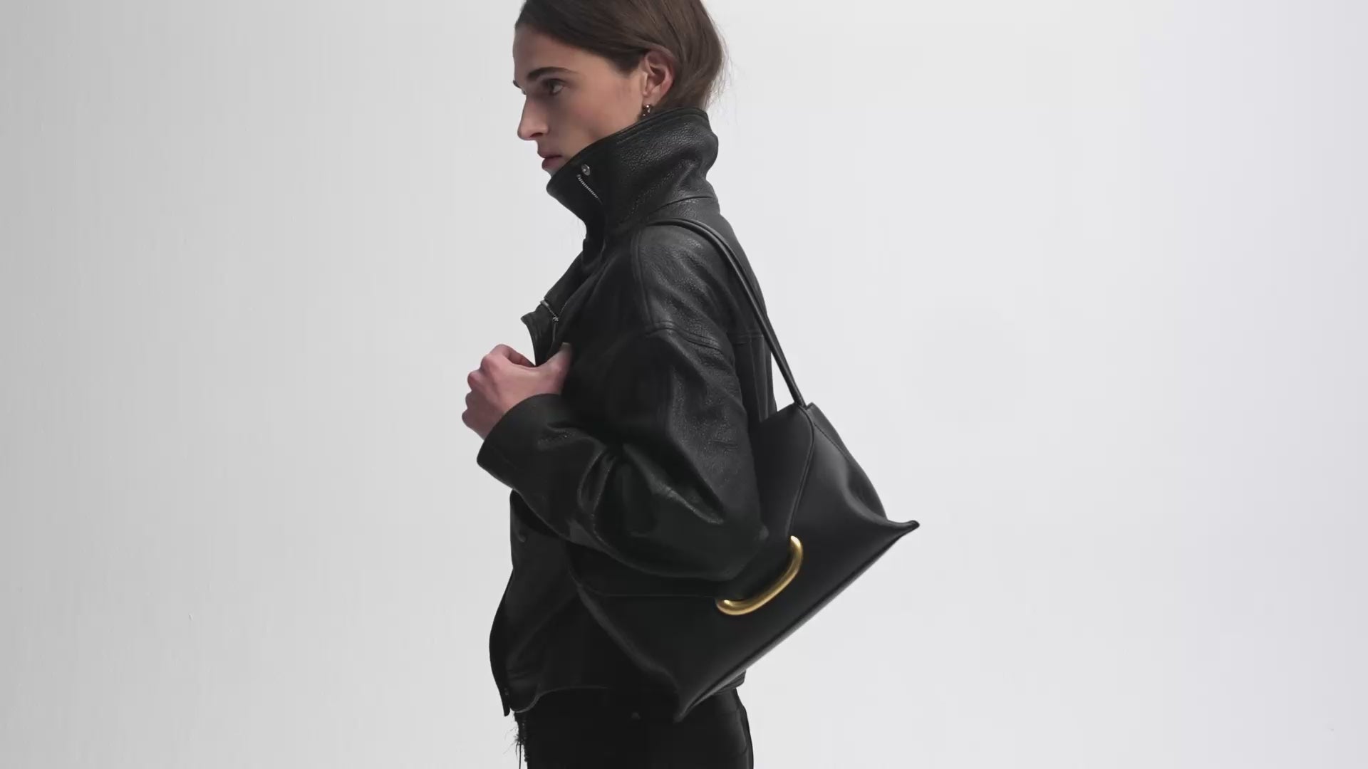 A structured silhouette defined by a bold oversized clasp, crafted to balance form and function.
