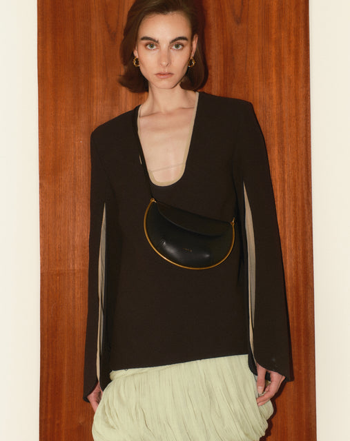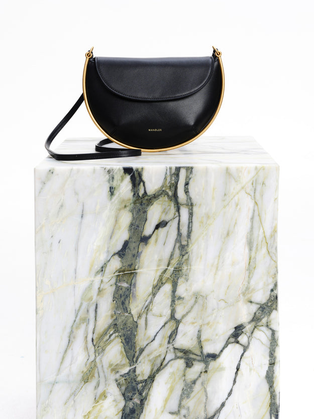 The golden frame and buckle are custom-made hardware designs. The strap of the Kate Bag is fully adjustable strap and combines comfort with sculptural style, allowing you to wear it crossbody or on the shoulder.
