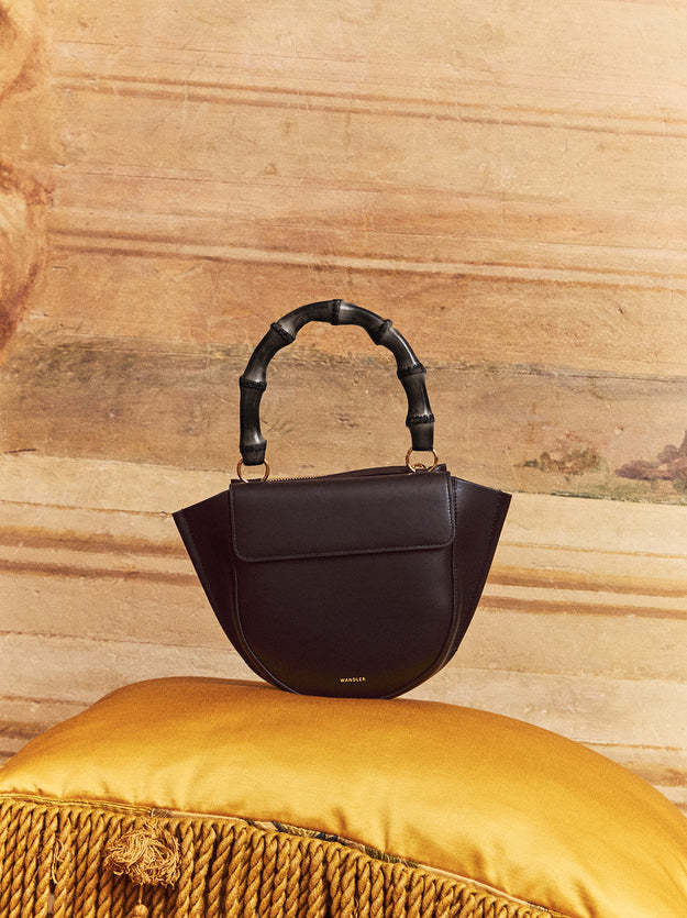 The Hortensia Bag, features a significant round shape with trapeze detail, giving it a soft feminine appearance. Its full silhouette has multiple pockets to keep belongings in place and two top handles – a hand-held and shoulder strap. The Hortensia Bag comes in a medium and mini, and piccola size.